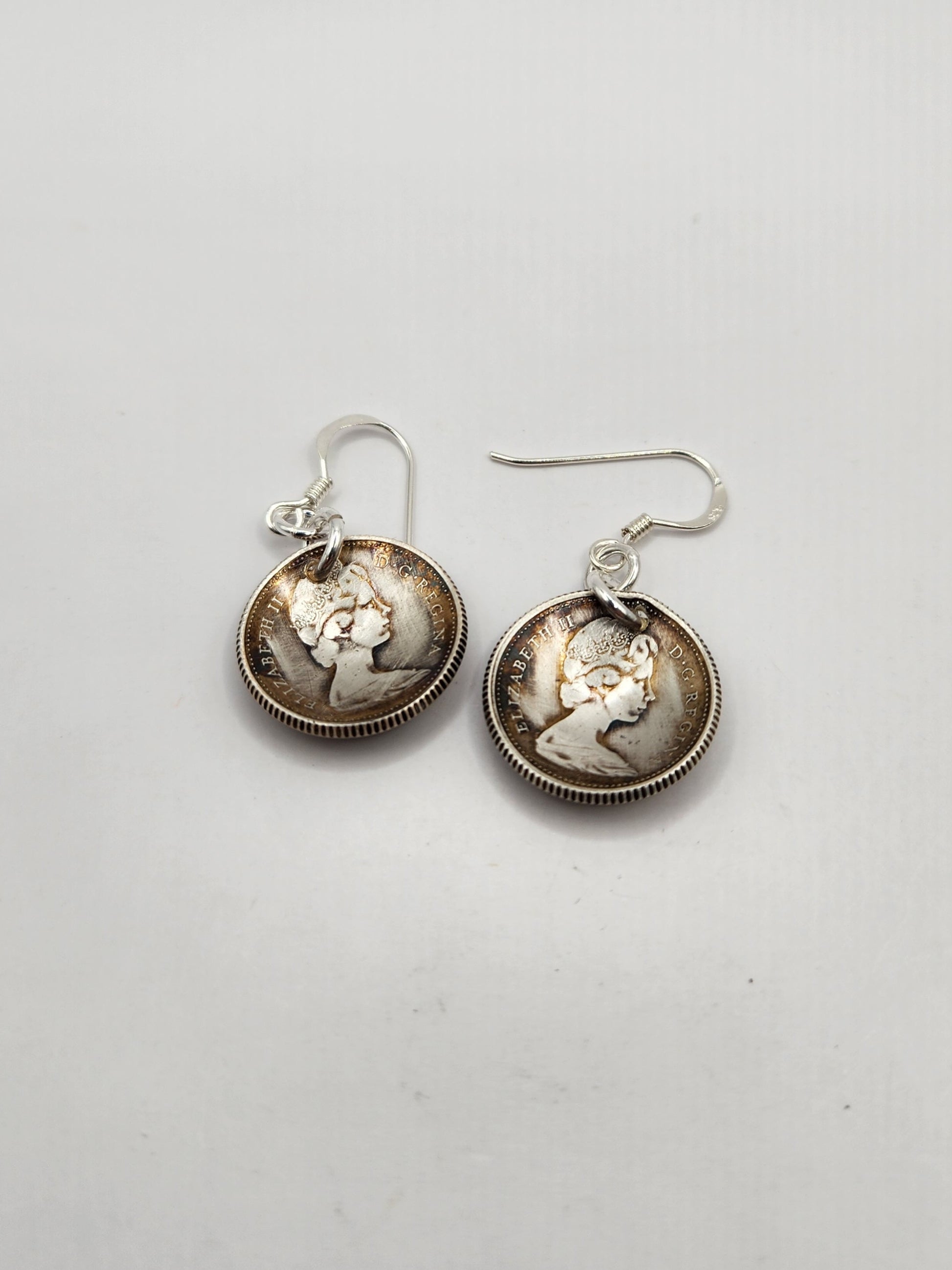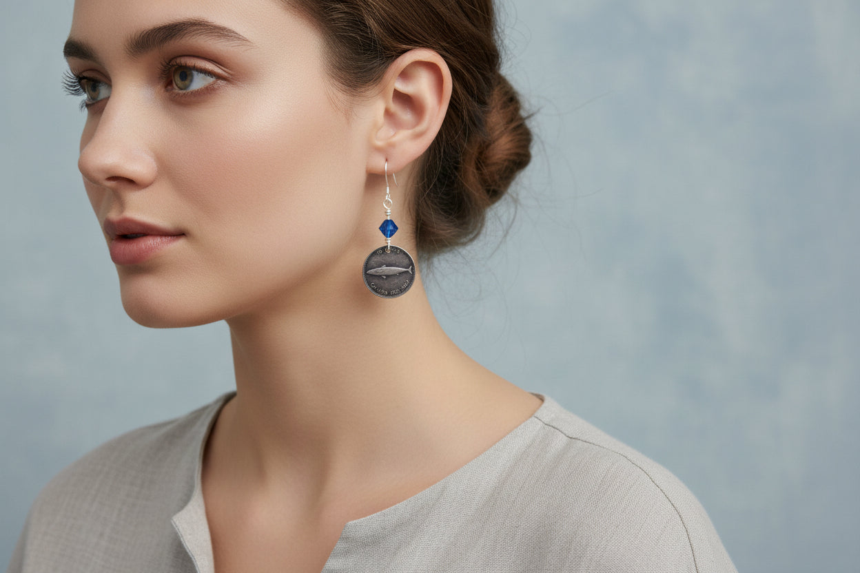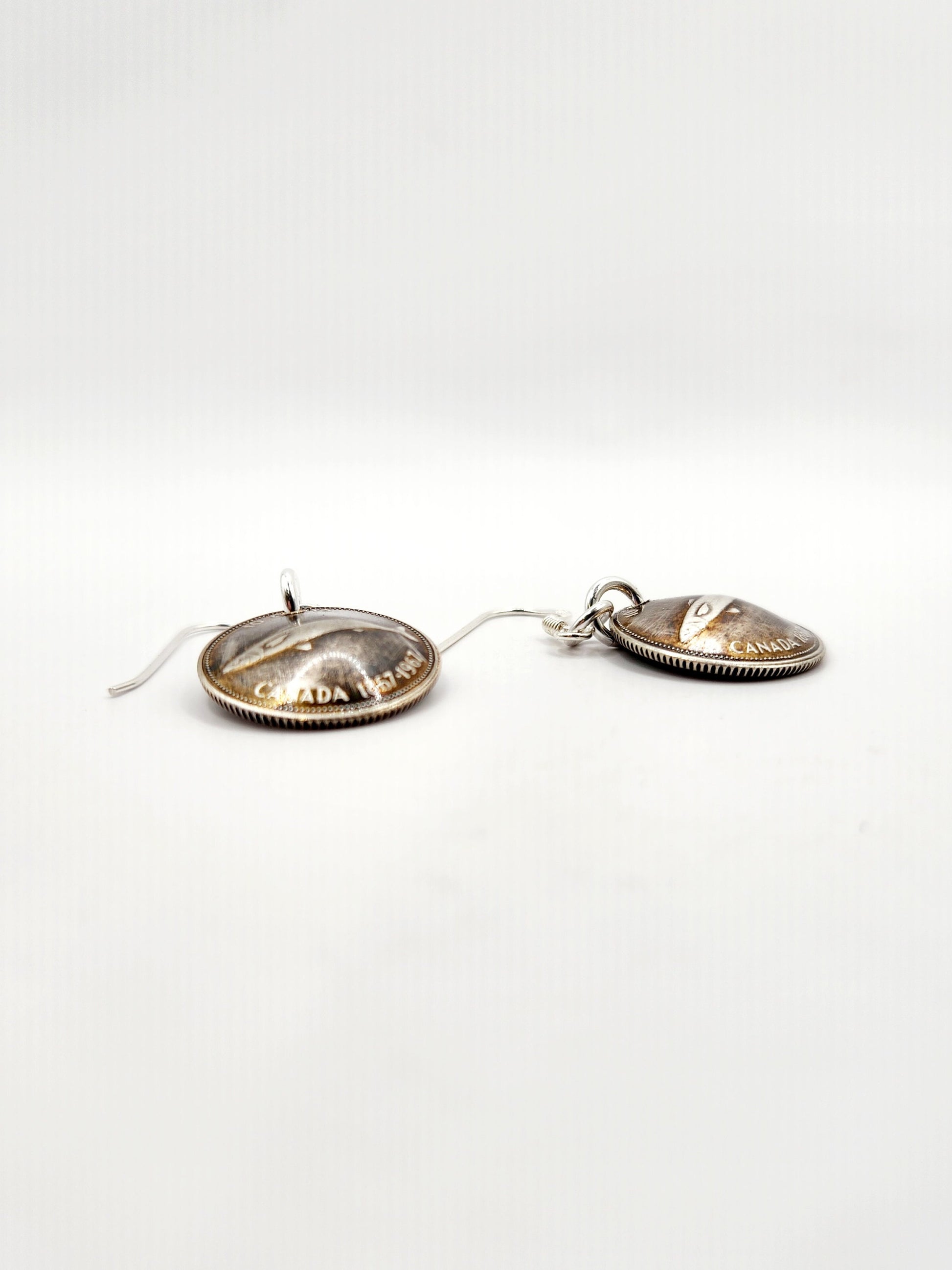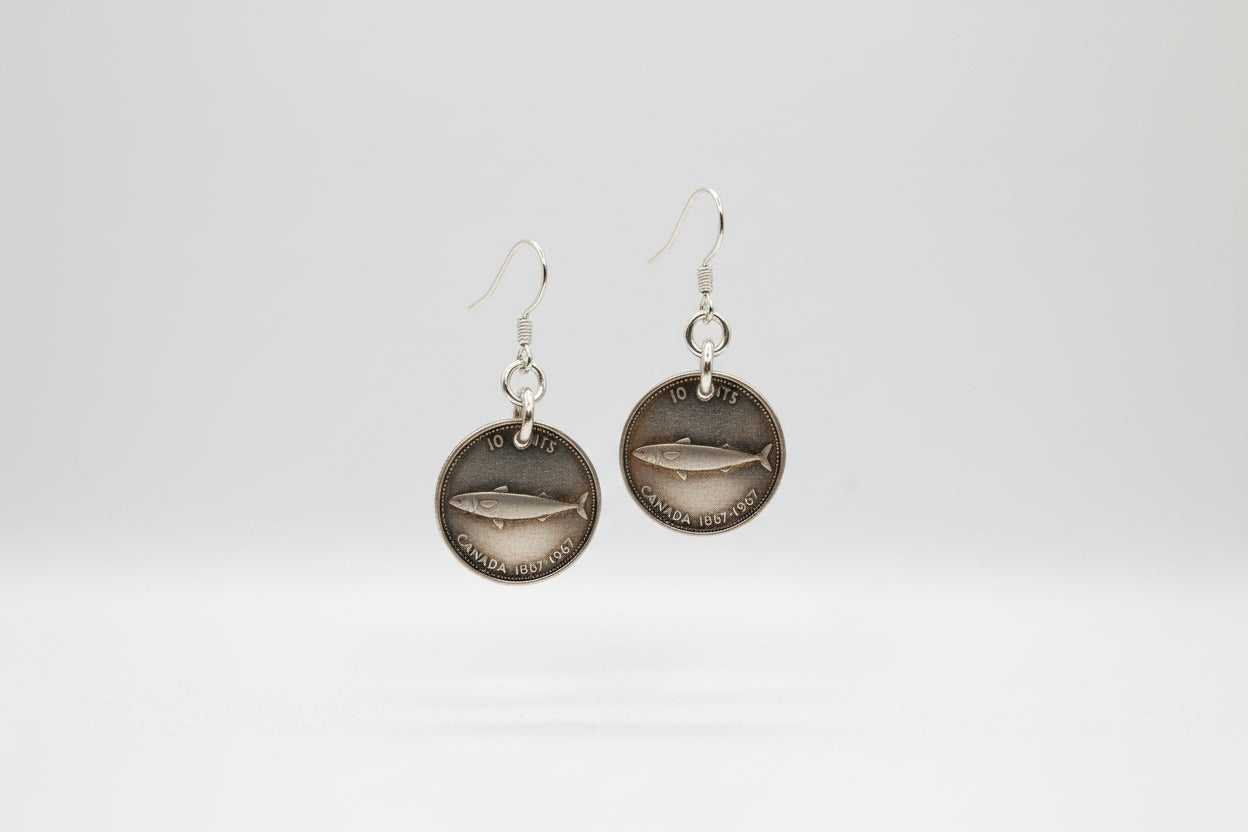 These elegant earrings breathe new life into a piece of Canadian history. Crafted from authentic 1967 Canadian Dimes, they feature the iconic Mackerel design, a special one-year-only issue created to celebrate Canada’s Centennial (1867–1967).