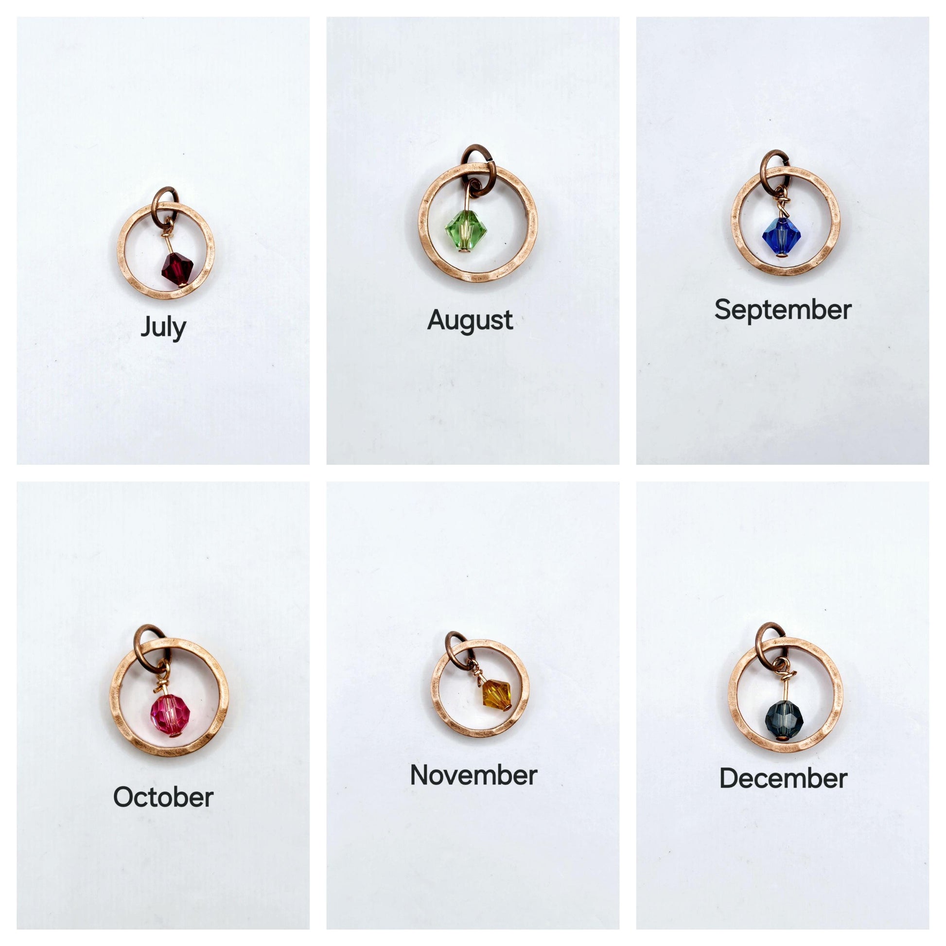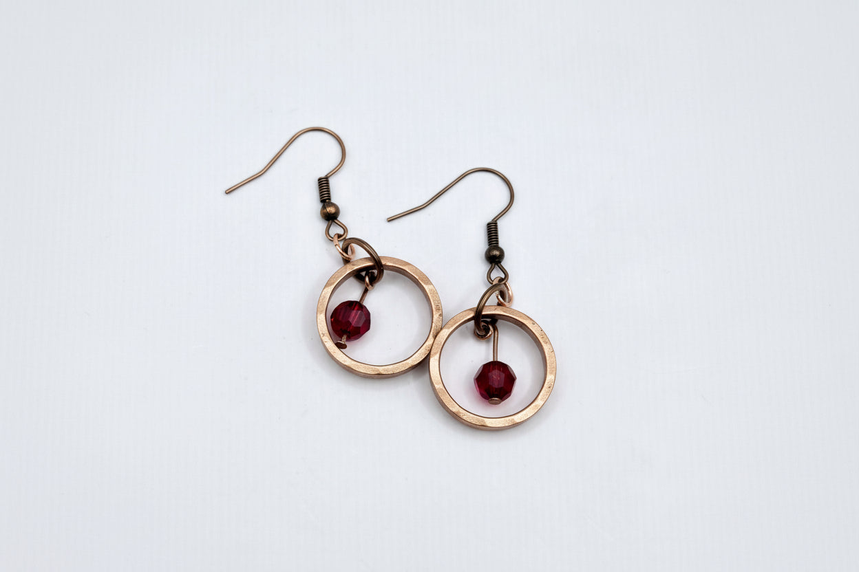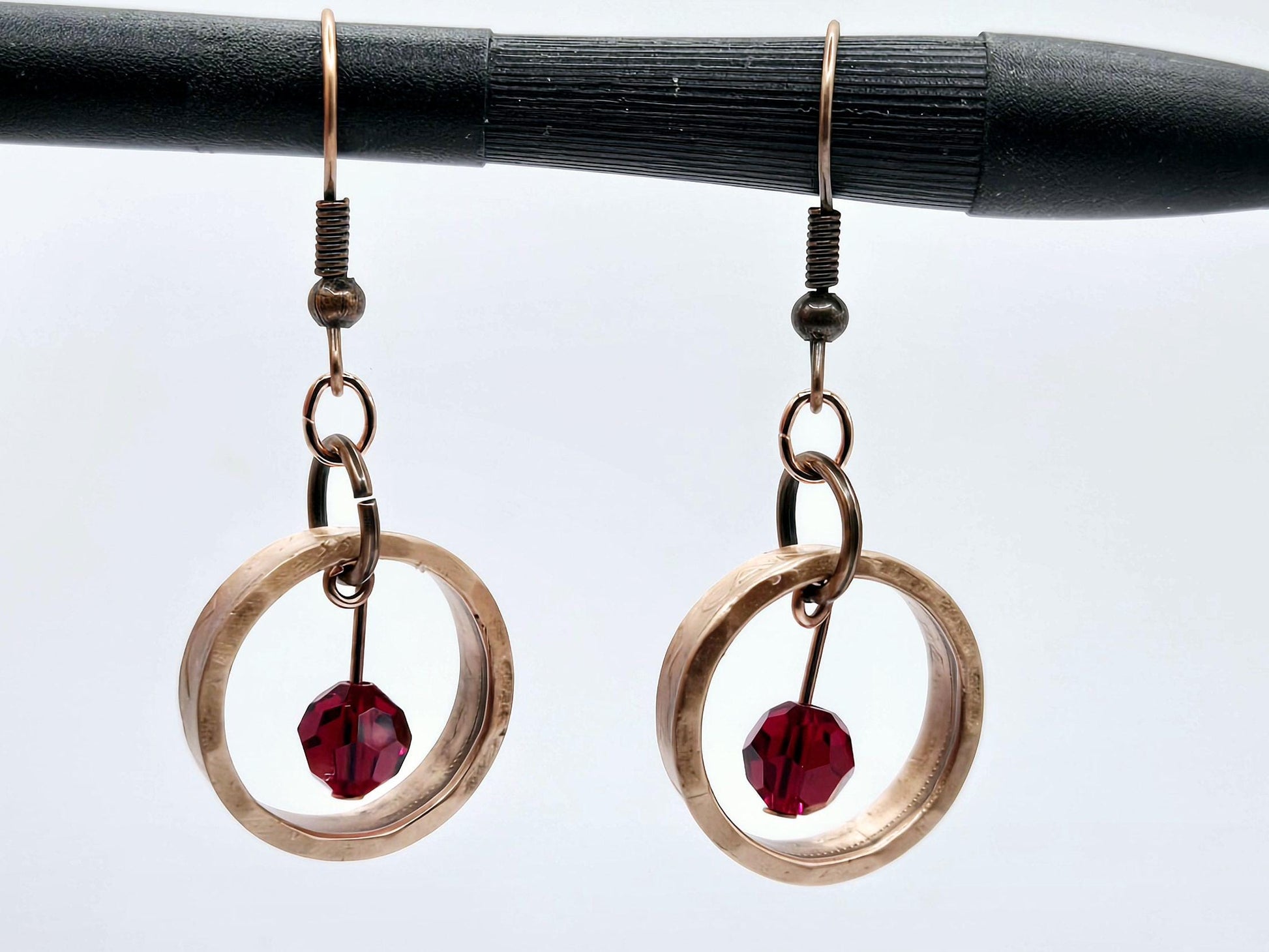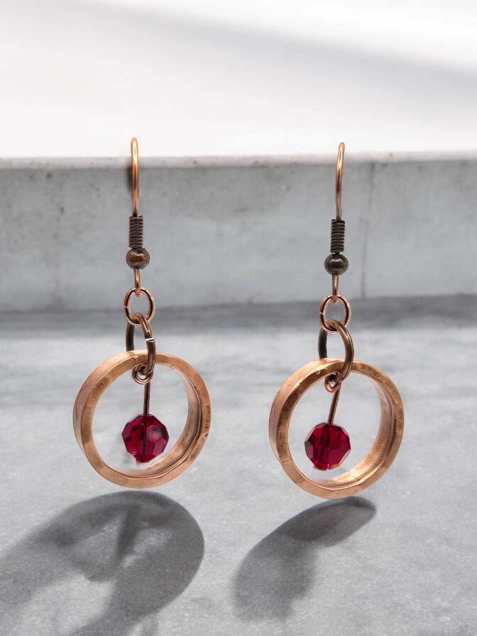 Handcrafted from authentic Canadian pennies, these distinctive earrings feature a polished coin ring paired with a sparkling Swarovski birthstone at the center. Each piece showcases the heritage and character of vintage currency transformed into wearable art. The copper ear wires ensure comfort for extended wear. A matching necklace option is available, featuring an 18" copper chain that complements the earring design perfectly. Personalize with your choice of birthstone to create a meaningful piece that celebrates your birth month or honors someone special.