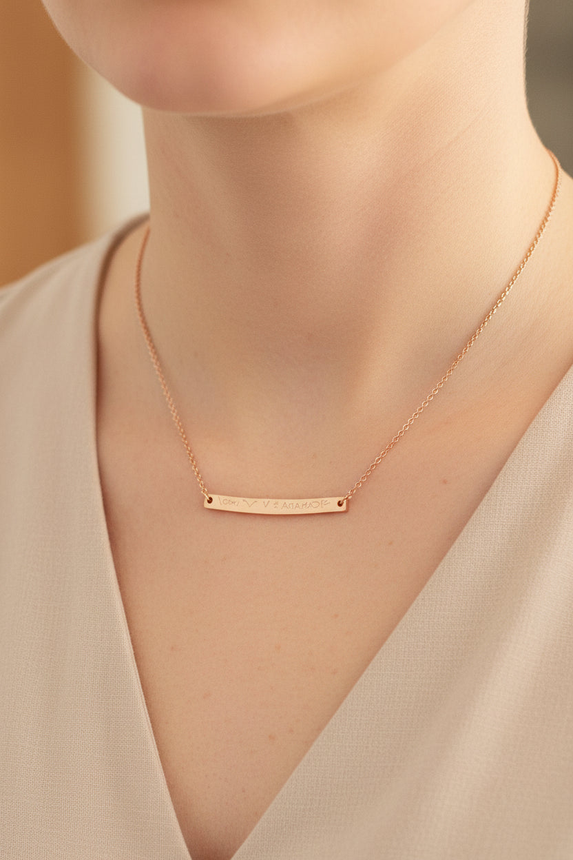 Necklace: A matching focal bar hung horizontally on a delicate 16-inch chain.