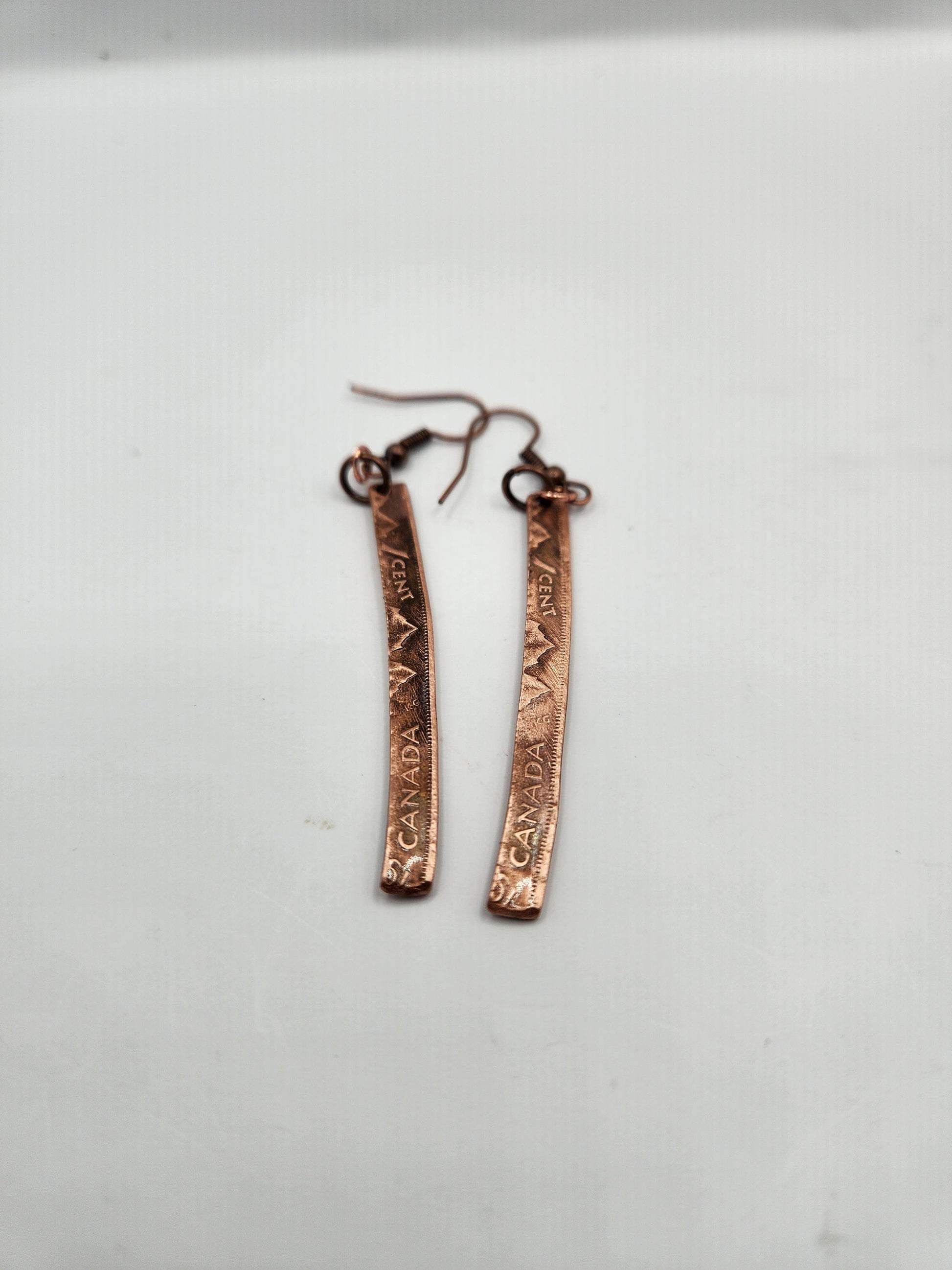 Earrings: Lightweight, slender bars suspended from hypoallergenic copper ear wires.