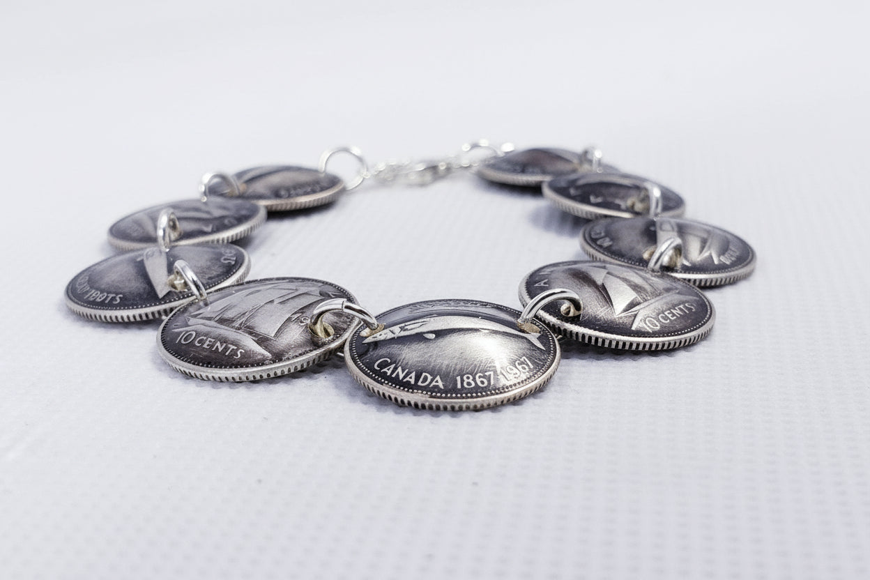 Crafted from nine authentic Canadian silver dimes, this distinctive bracelet alternates between the iconic Bluenose and 1967 Centennial designs, celebrating Canada's numismatic heritage. The bracelet is secured with a reliable magnetic clasp, complemented by a stainless steel safety chain for added peace of mind. A refined piece that merges historical significance with wearable artistry, perfect for collectors and those seeking meaningful Canadian craftsmanship.
