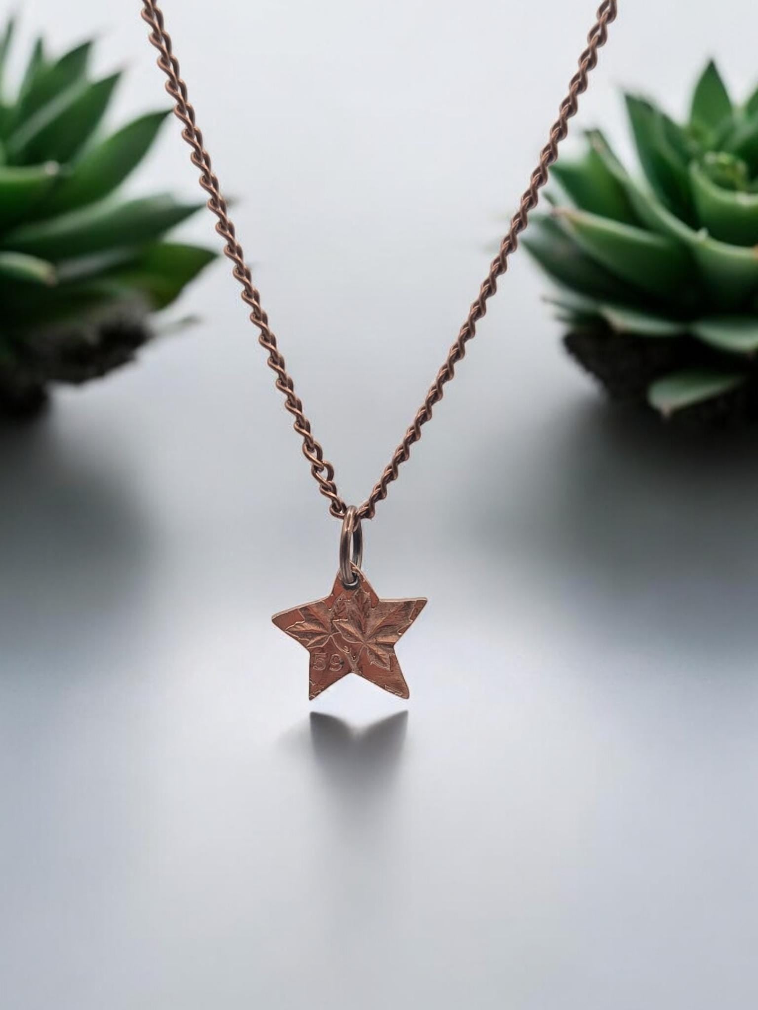 A timeless treasure. This unique pendant features a hand-carved star crafted from a genuine Canadian penny. A touch of Canadian history to wear close to your heart. Each one is cut out by hand and will vary slightly from the pictures. The chain is 18", hypoallergenic copper with a lobster clasp.