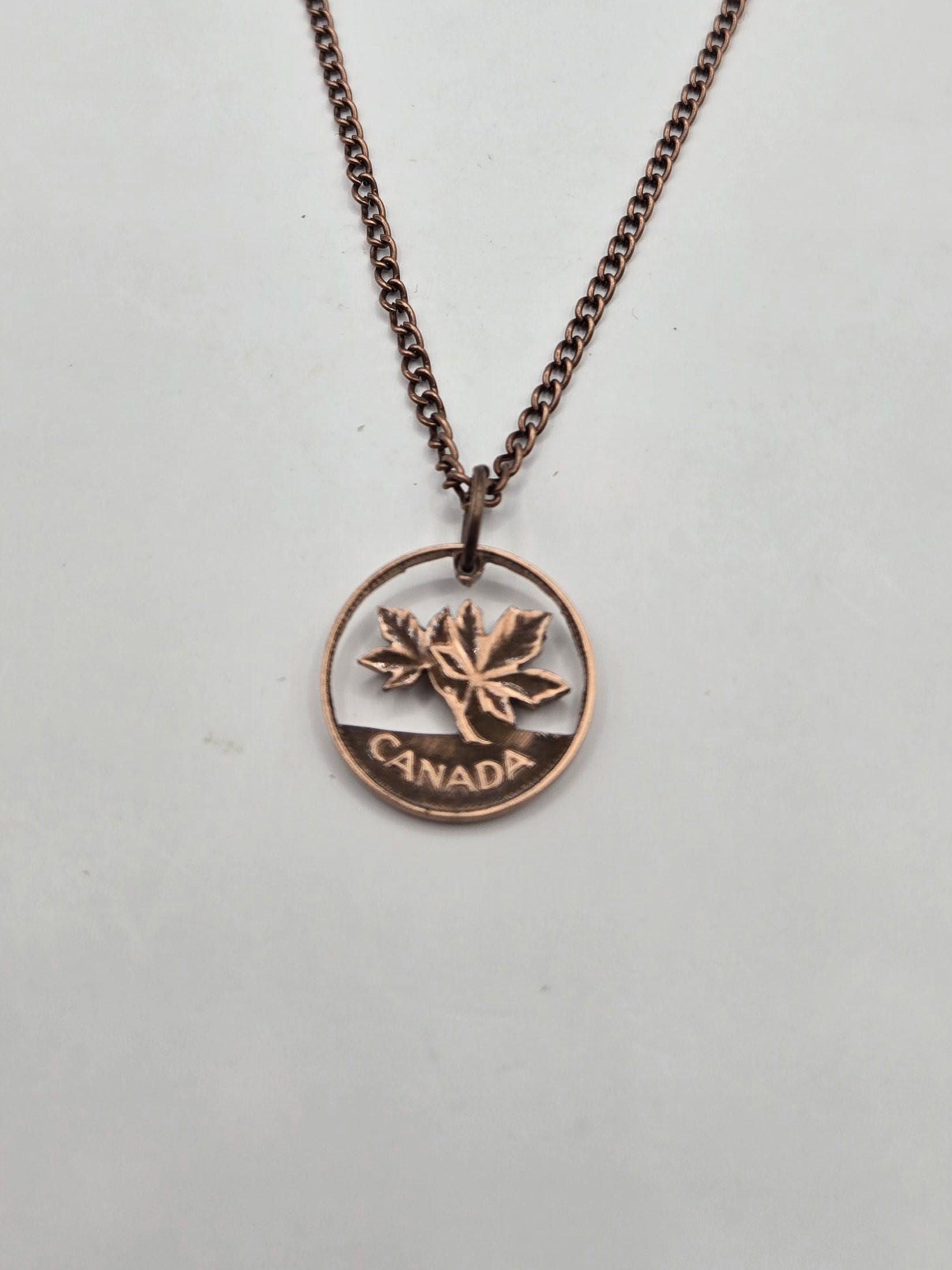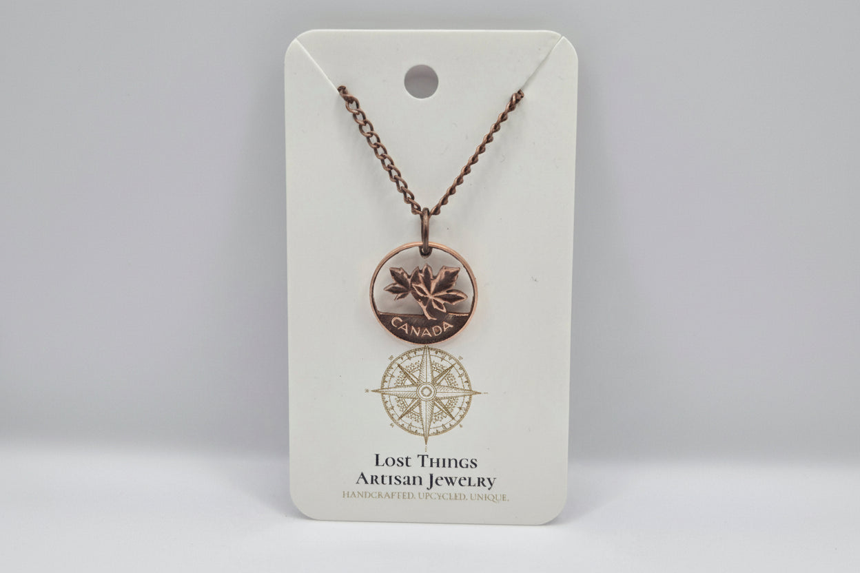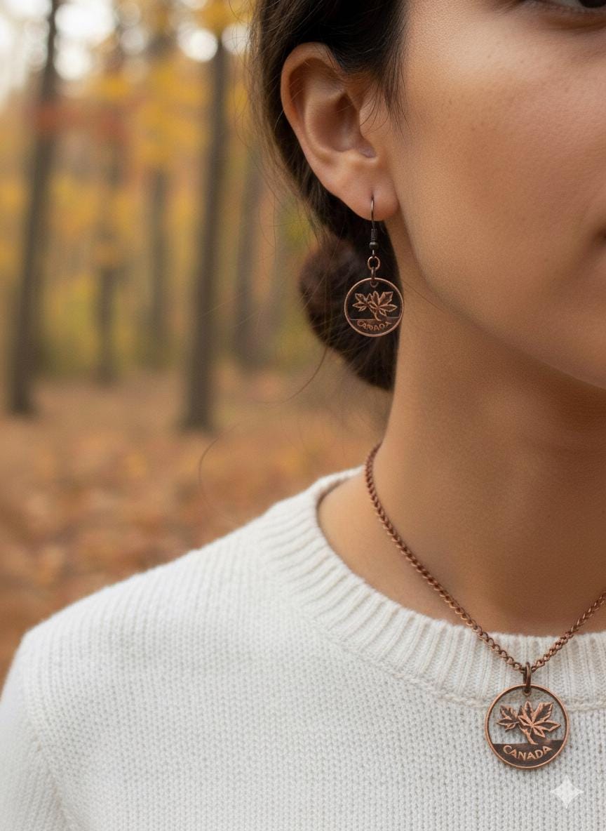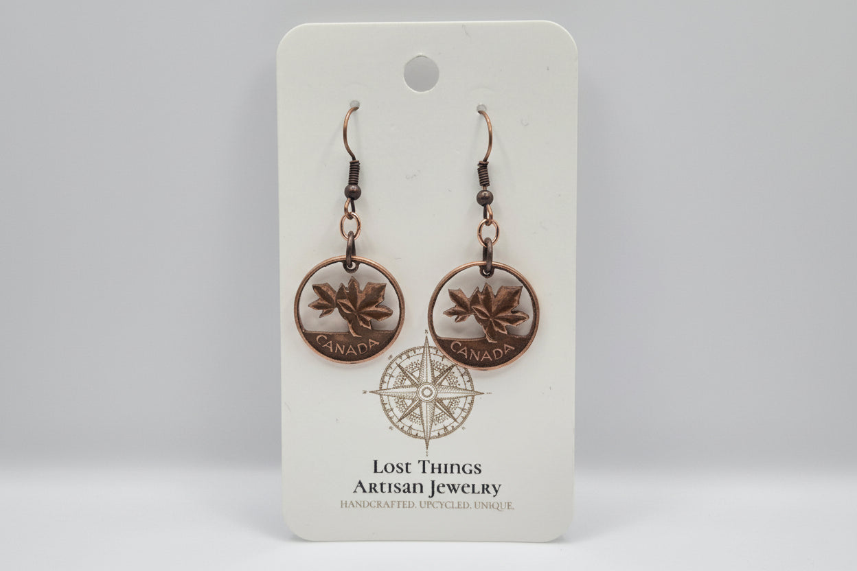 Transform vintage Canadian pennies into wearable art with these hand-cut coin pieces. Each design is meticulously carved to reveal intricate details, celebrating Canada's numismatic heritage. Choose between striking earrings featuring copper ear wires or an 18" copper chain necklace—both showcase the distinctive patina and character of authentic pennies. Perfect for collectors, history enthusiasts, or anyone seeking distinctive jewelry with a story. Every piece is uniquely crafted, making it a one-of-a-kind addition to your collection.