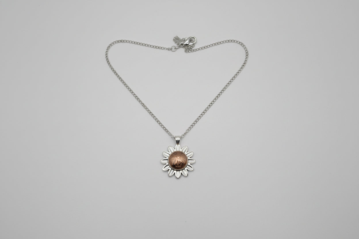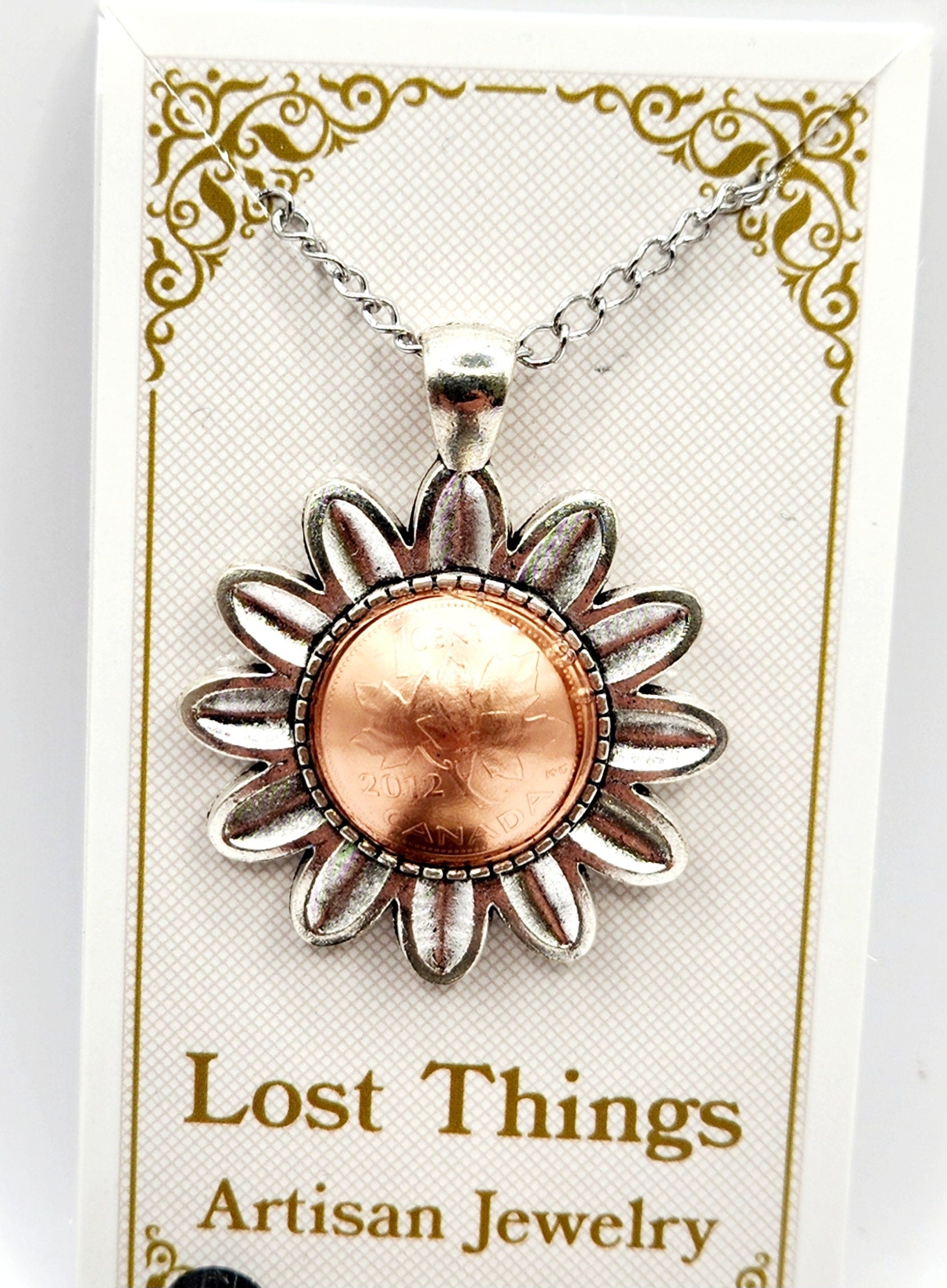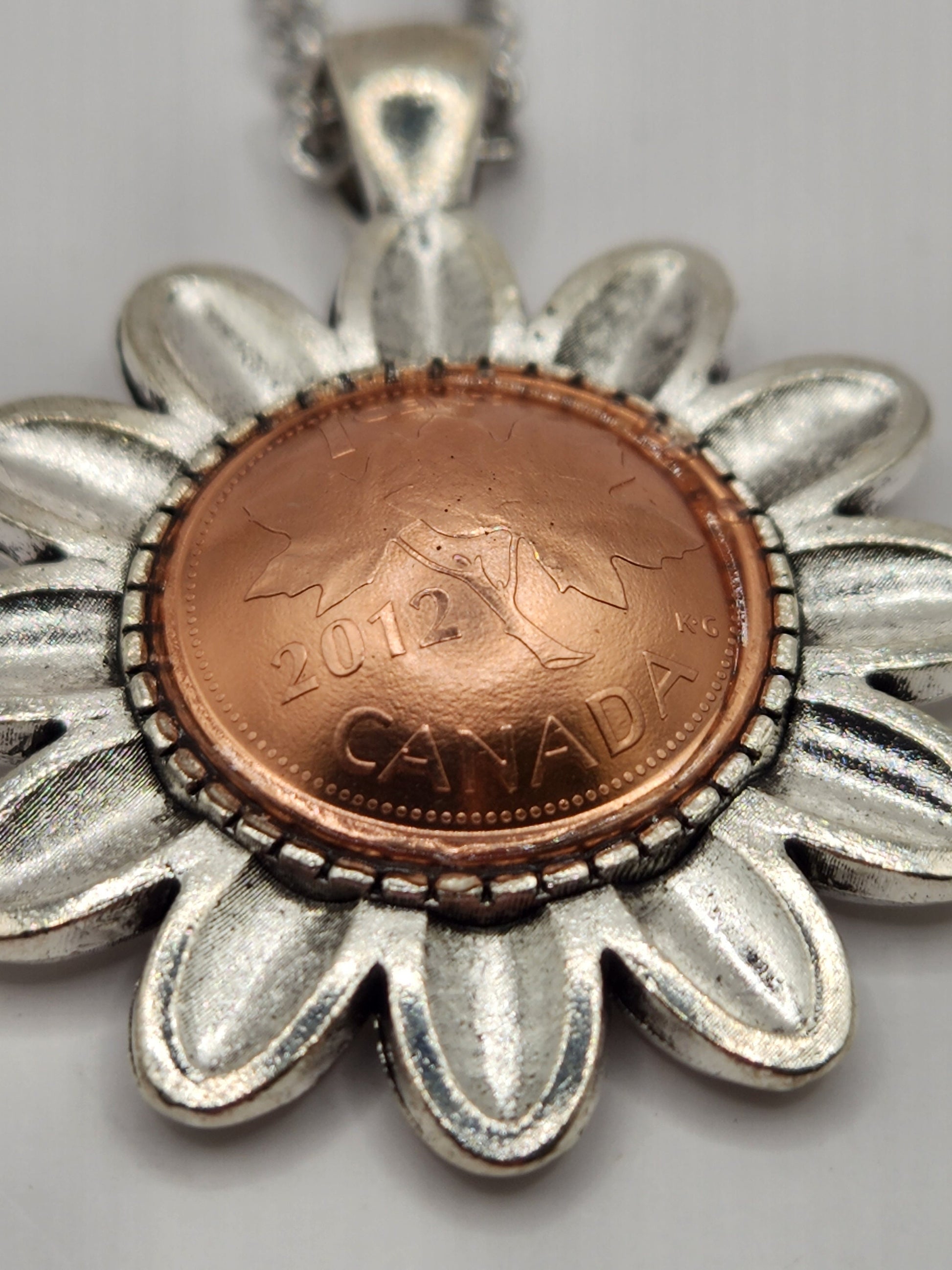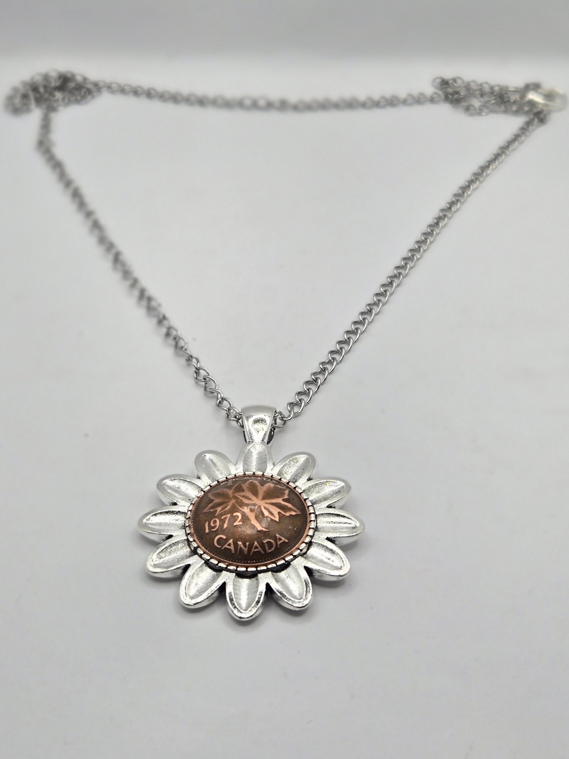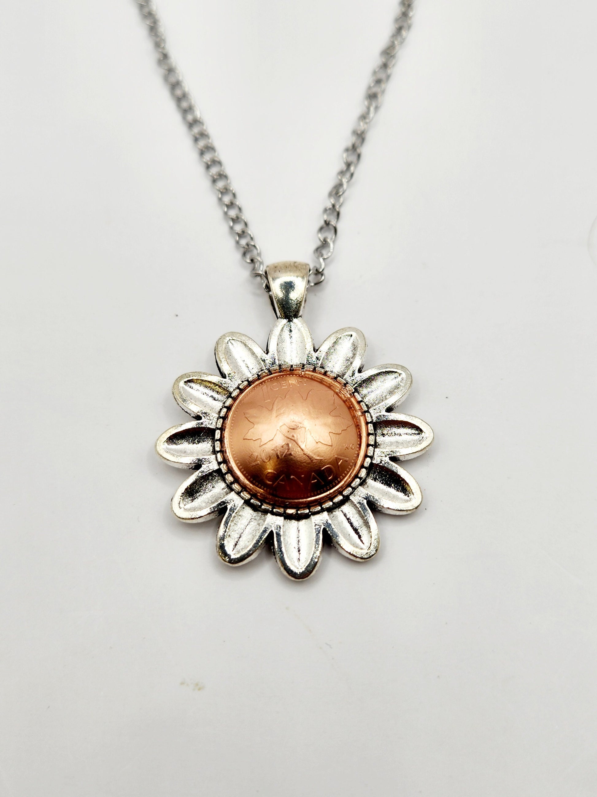 Carry a piece of history and a symbol of blooming hope with this unique, handcrafted necklace. Featuring a genuine Canadian Penny nestled inside a whimsical daisy-shaped bezel, this piece blends vintage nostalgia with timeless floral charm.