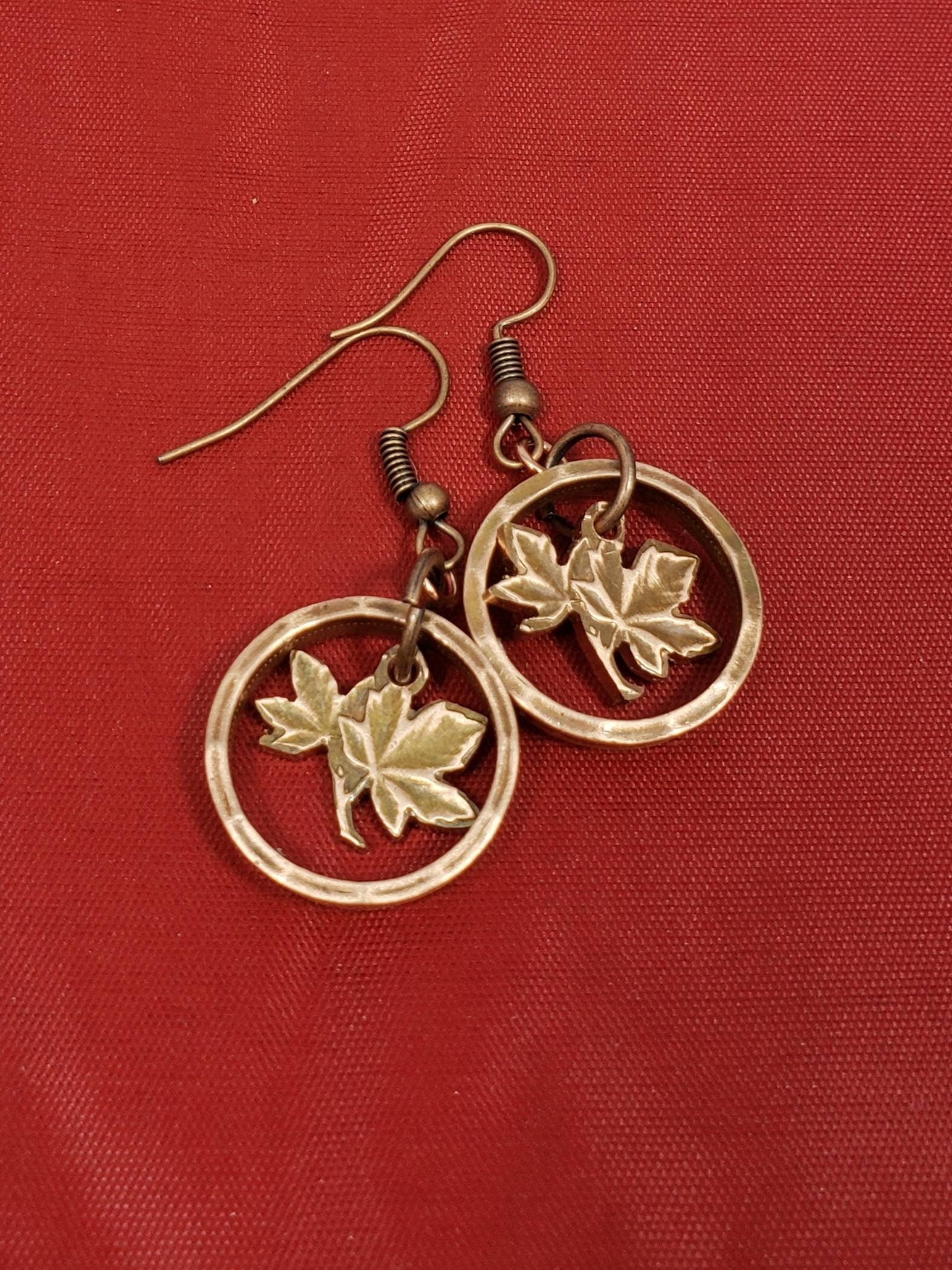 Hand-carved maple leaf designs sourced from authentic Canadian pennies, expertly set into rings crafted from reclaimed pennies. Each piece celebrates Canadian heritage through meticulous artisanal work. Choose from elegant earrings, a delicate necklace, or acquire both for a cohesive collection. Perfect for those who appreciate numismatic artistry and sustainable jewelry craftsmanship.