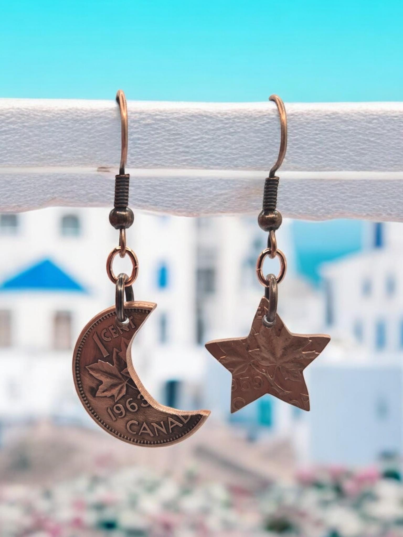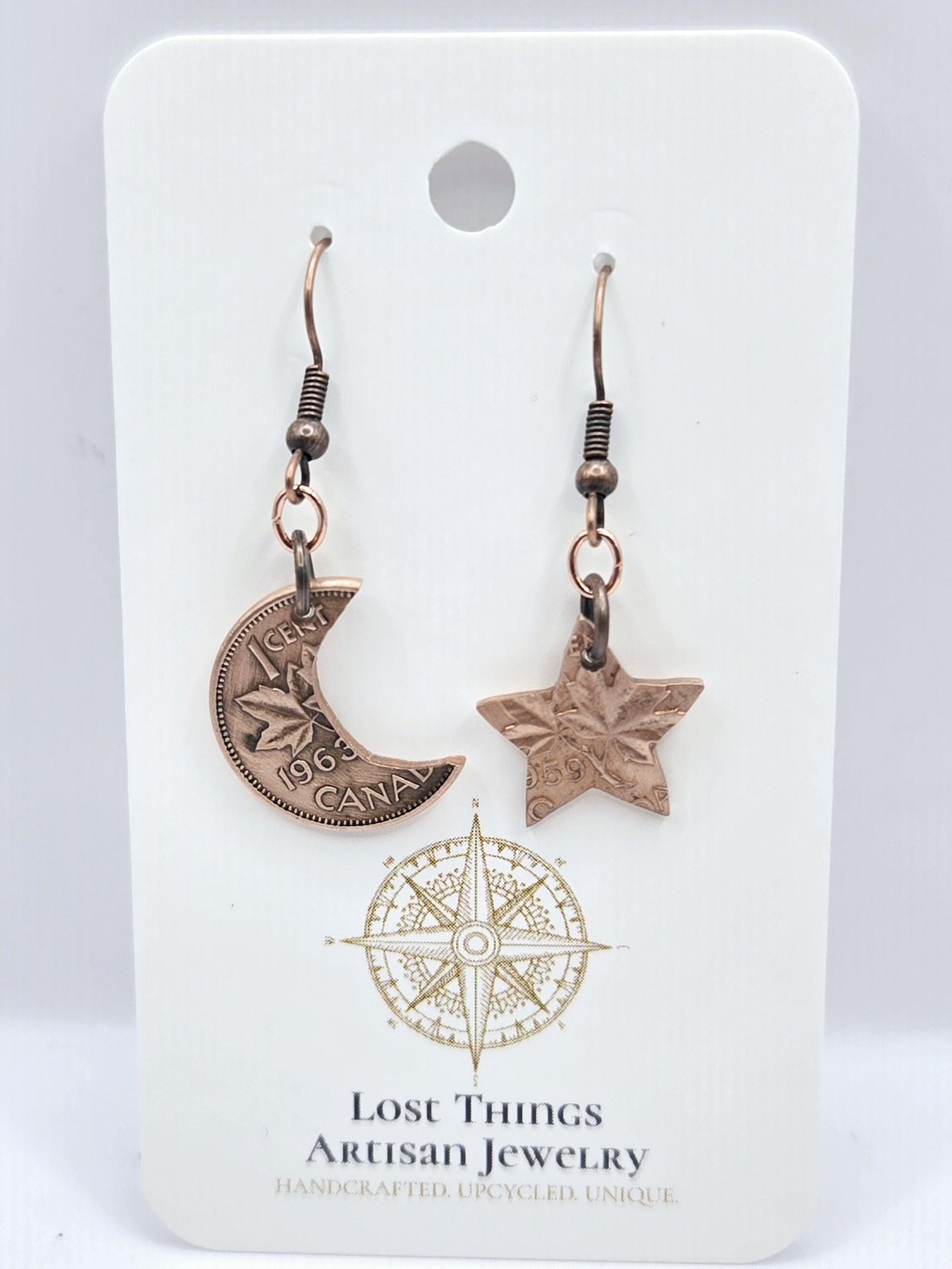 Journey to the cosmos with these enchanting earrings. Handcrafted with care in Canada, each pair features a delicately formed moon and star, meticulously crafted from recycled Canadian pennies. These unique earrings are not only a beautiful accessory but also a conversation starter, reminding us of the enduring power of creativity and the boundless possibilities of the universe. Each piece is meticulously hand cut so every pair will be unique. The ear wires are hypoallergenic copper.