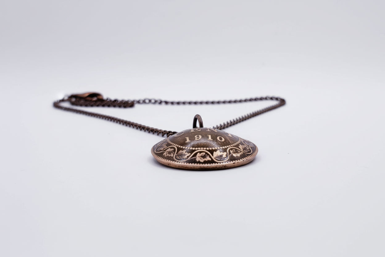 Crafted from authentic Canadian pennies minted between 1858 and 1920, this distinctive pendant captures a century of Canadian heritage. Each piece features a genuine vintage coin paired with an 18-inch copper chain, creating a wearable connection to history. Nickel-free construction ensures comfort for sensitive skin. A thoughtful choice for collectors and history enthusiasts seeking meaningful, one-of-a-kind jewelry.