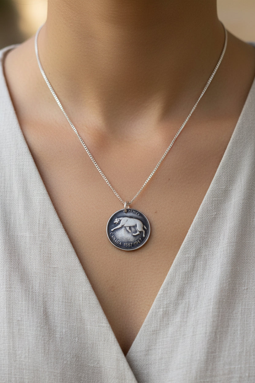 Celebrate a milestone in Canadian history with this handcrafted pendant, repurposed from an authentic 1967 Canadian Silver Quarter. Issued to commemorate the 100th anniversary of Confederation, this coin is a favorite among collectors and jewelry lovers alike for its stunning, minimalist design.